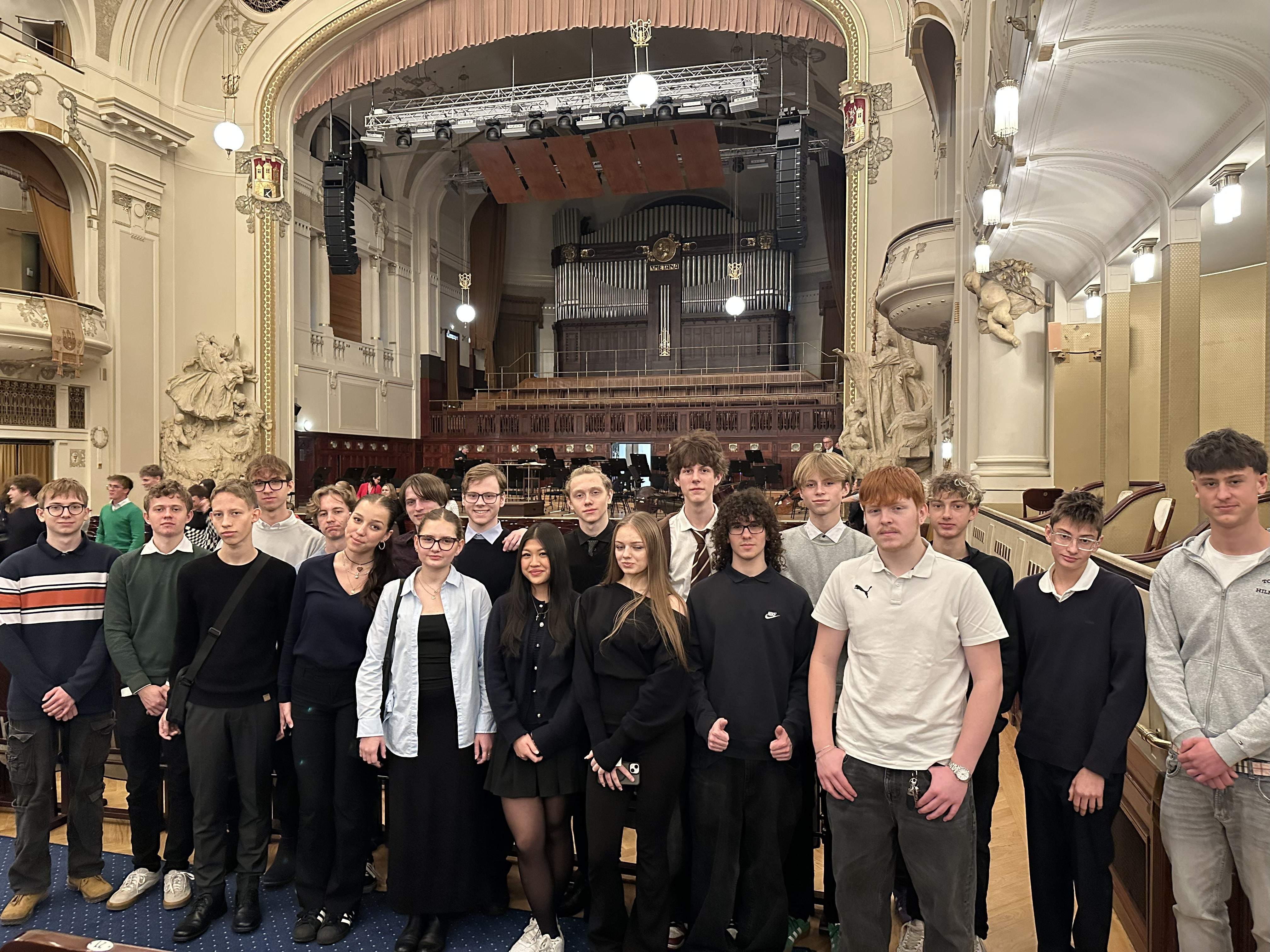 V pondělí 11. listopadu se studentky a studenti hudební výchovy z tříd G1.E a G2.E vydali na „expedici za horizont hudby“. Navštívili komentovaný koncert Symfonického orchestru hlavního města Prahy FOK v prostorách Smetanovy síně Obecního domu.