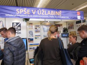 Schola Pragensis 2012 - studenti třídy E4A odpovídají na dotazy návštěvníků našeho stánku
